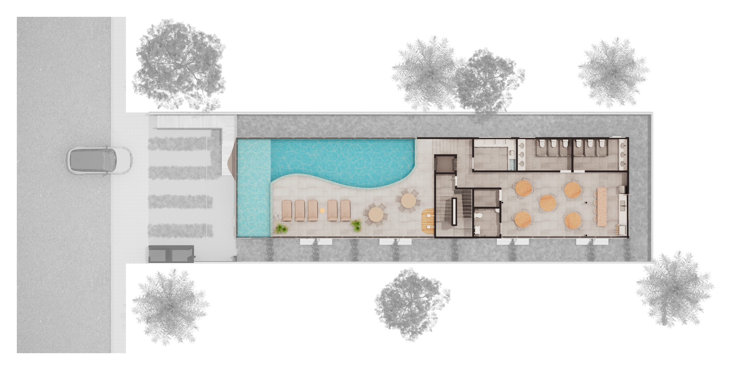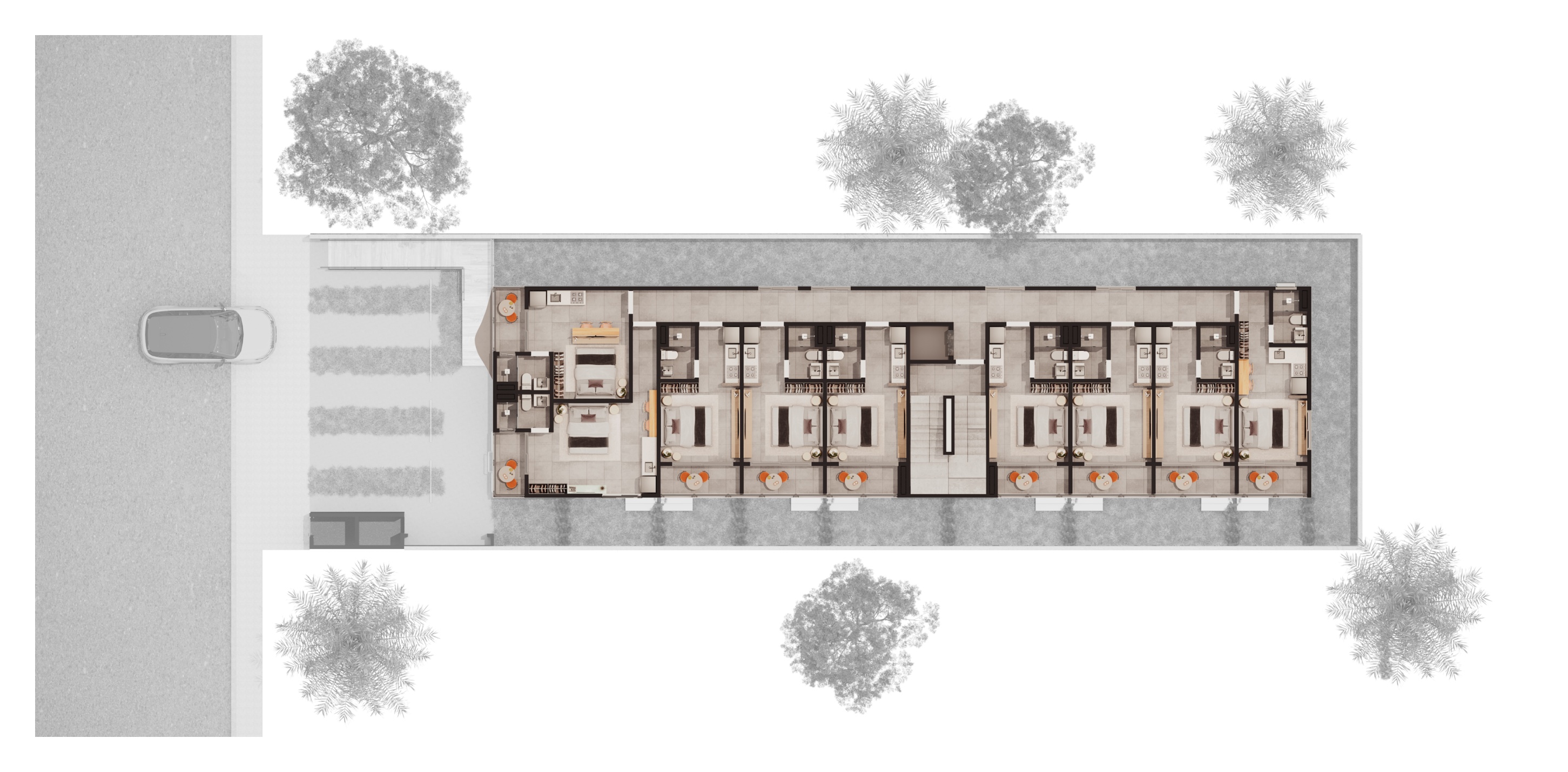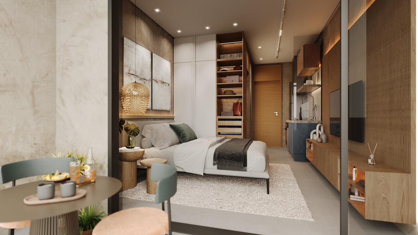 São 26 unidades tipo flats que vão desde 21m² a 26,90m² com terraço ou varanda, distribuídas entre o pavimento térreo e demais pavimentos.