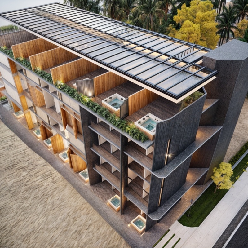 Empreendimento composto por subsolo com vagas rotativas, guarita, elevador, piscina, academia, apartamentos térreos com opção de hidromassagens, flats com e sem varanda, e apartamentos com rooftop exclusivo.