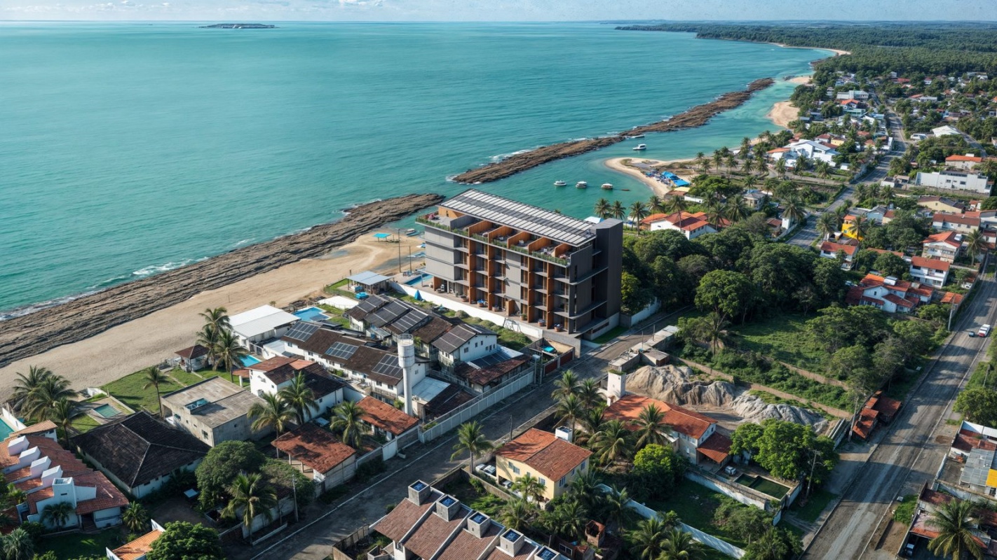 Em Serrambi, pé na areia, com uma arquitetura moderna, fachada privilegiando vista e ventilação.